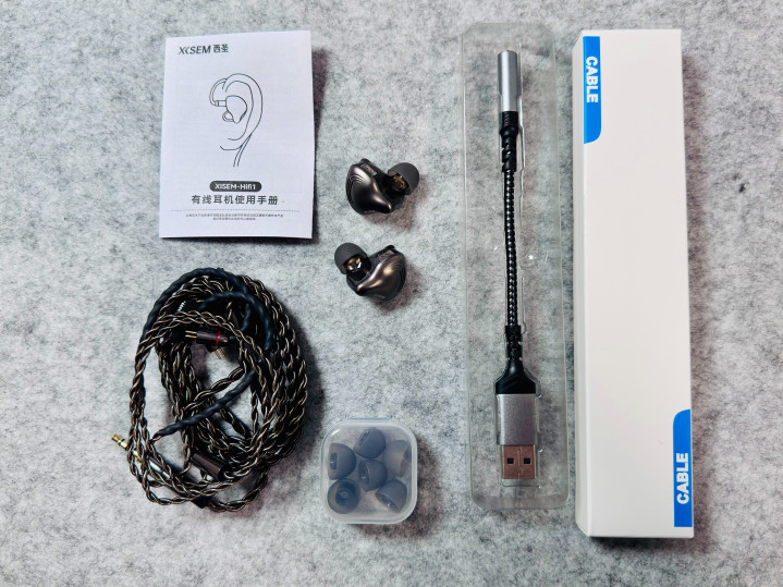 打开盒子,我发现大有说法,耳机头跟线是分离的设计。而且针对不同耳形给了共四对耳帽。另外还有一根USB高速数据线,当然你可以拿来插电脑接音频用(如果你的电脑没有3.5mm接口的话)。